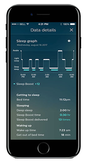 Zodra de trage-golf-slaap gemeten wordt, activeert het algoritme stille geluidsgolven die deze trage golven een boost geven en zo de kwaliteit van je slaap verbeteren.