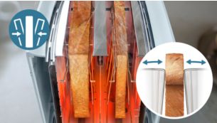 Het zelfcentrerende mechanisme centreert elk sneetje perfect voor een gelijkmatig bruiningsresultaat aan beide kanten - ongeacht de dikte van uw brood.