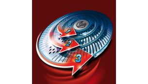 De drie scheerringen hebben 50% meer scheeroppervlakte zodat u zich snel kunt scheren. *In vergelijking met standaard roterende scheerhoofden.
